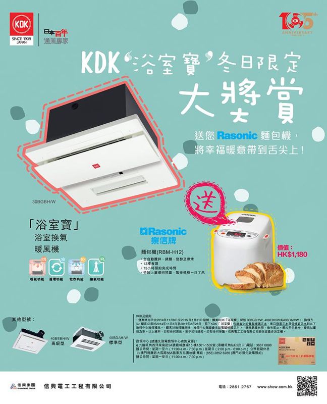 由2014年11 月 8日 至 2015年1月 31日,凡購買指定型號 KDK「浴室寶」一部,剪下KDK「浴室寶 」包裝盒上的電腦條碼 、連同發票正本 及保修証正本 於2015年 2 月28日或之前到換領中心,即可免費獲贈 Rasonic樂信牌麵包機(RBM-H12)乙部。