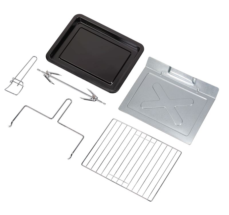 • Accessories: Grill rack / Bake tray / Rotisserie spit / Spit bracket / Bake tray handle / Removable crumb tray