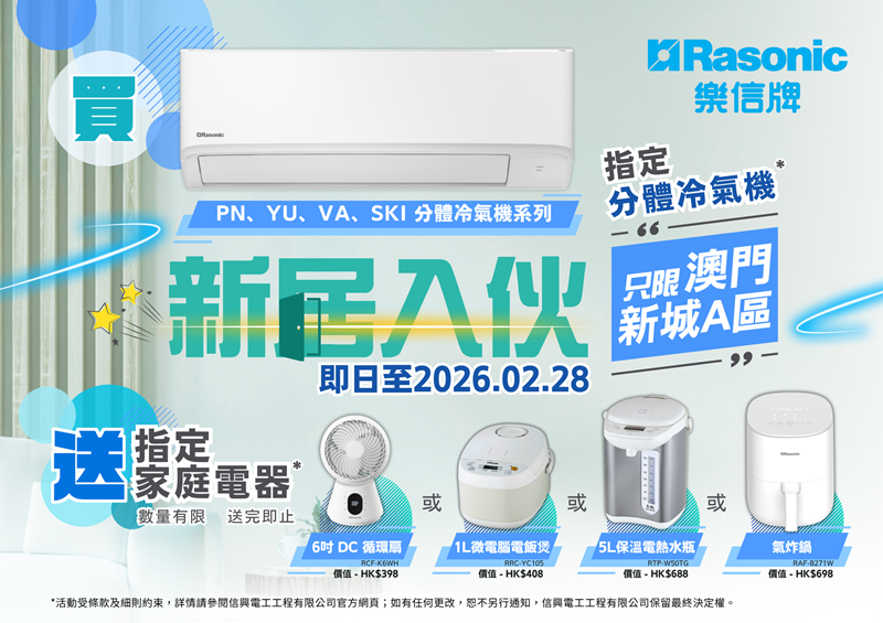 During the promotion period, purchase the following specified models of Rasonic Split Type Air Conditioner* can entitle the selected Rasonic home appliance free. Limited quantity available, while stocks last. (Only applicable to Macau retailers)
