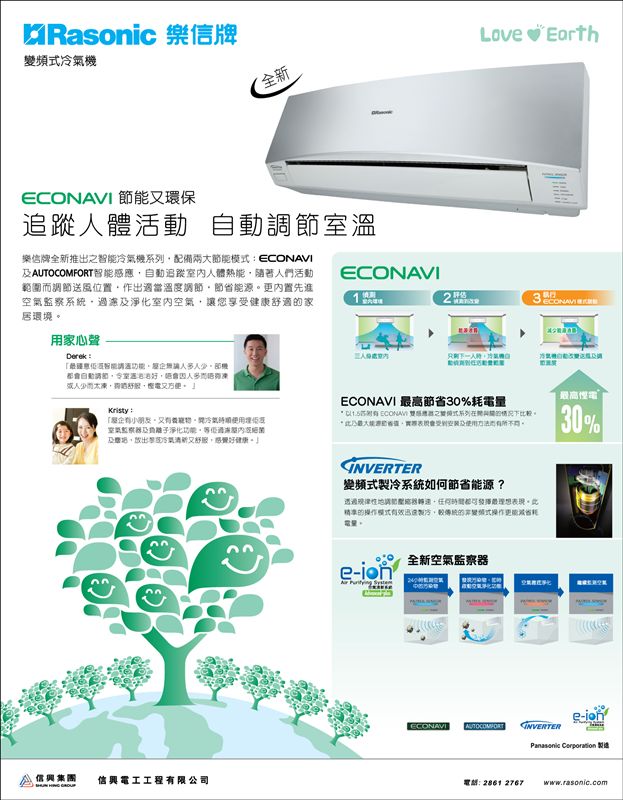 全新Rasonic樂信牌變頻式分體式冷氣機,配備ECONAVI節能模式及AUTOCOMFORT舒適模式,能透過紅外線感應器追蹤室內人體熱能,隨著人們活動而調節送風位置,作出適當温度調節,節省能源。更內置先進空氣監察系統,過濾及淨化空氣,讓您享受健康舒適的家居環境。