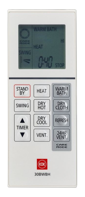 • Heating, Dry Hot (Clothes Drying) and Dry Cool (Circulation) functions with Hi / Lo selection; Ventilation function with Hi / Mid / Lo selection